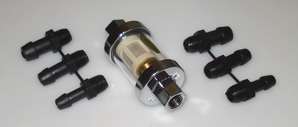 HIGHWAY HAWK Топливный фильтр, с прозрачным корпусом, хромированными торцами и тремя вариантами штуцеров. В комплект входит фильтрующий элемент, два штуцера для шланга с внутренним диаметром 6 мм, два штуцера для шланга 8 мм и два штуцера для шланга 10 мм. Максимальный диаметр корпуса 28 мм. Длина корпуса с установленными штуцерами 107 мм.