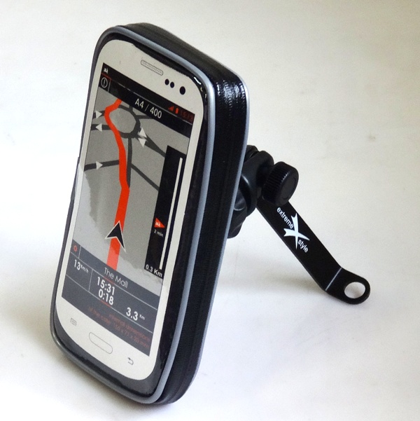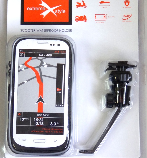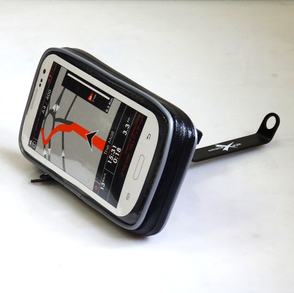 Лицевая часть чехла выполнена прозрачной. На оборотной стороне расположено крепление, позволяющее легко снять чехол с кронштейна. Внутренняя часть чехла выполнена из мягкой ткани, предохраняющей находящееся в нём устройствo. Кронштейн позволяет регулировать угол наклона устройства и даже поворачивать его на 360 градусов. Кронштейн легко крепится под зеркало, или другие крепёжные элементы , без использования специального инструмента. Обладает огромным диапазоном регулировок, позволяющим закрепить чехол на любом мотоцикле, квадроцикле или скутере.