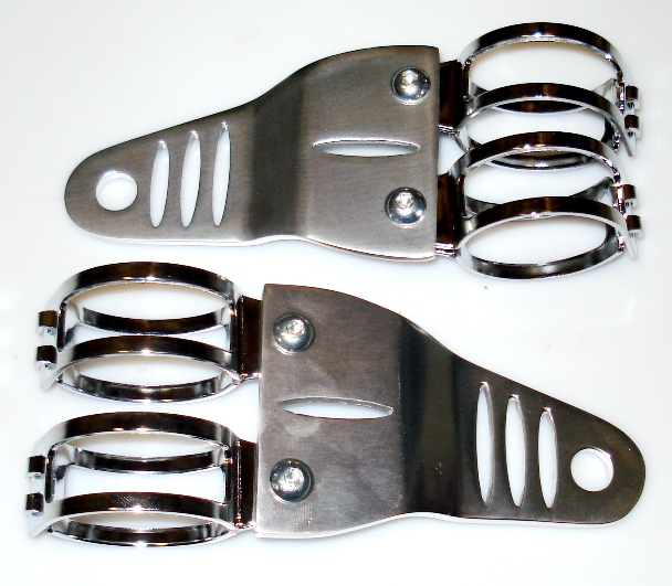 PW Крепление фары. Комплект из двух кронштейнов, четырёх креплений к перу вилки, диаметром от 43 до 46мм и четырёх винтов, с головкой в форме линзы с внутренним шестигранником, с гайками. Материал кронштейнов — полированный алюминий. Материал хомутов - хромированная сталь.
