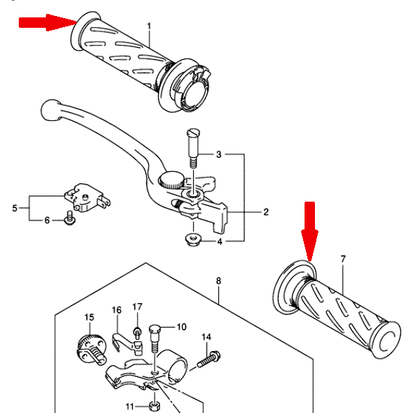 Правая, аналог 57110-29G00-000 (5711029G00000), 57110-29G01-000 (5711029G01000), 57110-29G02-291 (5711029G02291), 57110-46E01-000 (5711046E01000), 57110-46E02-000 (5711046E02000), имеет посадочный диаметр 25 мм для установки на поворотную пластиковую втулку ручки газа (втулка в комплект не входит).