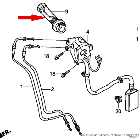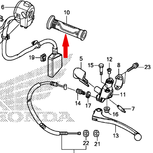 Правая, аналог 53140-KYJ-305 (53140KYJ305), 53140-KYJ-900 (53140KYJ900) имеет посадочный диаметр 25 мм для установки на поворотную пластиковую втулку ручки газа (втулка в комплект не входит).